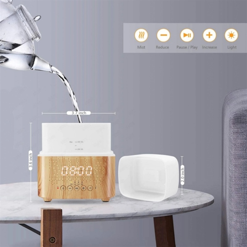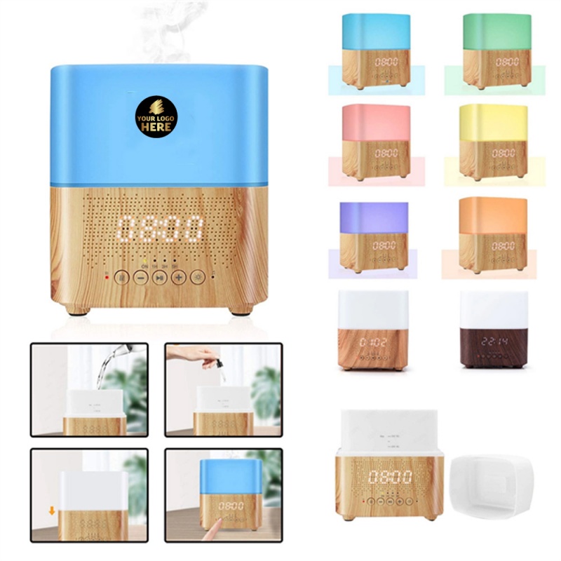 Upgrade your nights with this multifunctional marvel! This sleek, space-saving gadget combines an LED alarm clock with customizable alarms, a soothing humidifier to refresh your space, vibrant mood lighting for relaxation, and crystal-clear Bluetooth audio for tunes or podcasts. Crafted with a stylish woodgrain base and available in assorted colors, it's perfect for bedrooms, offices, or dorm rooms. Personalize it with your logo for a unique touch--ideal for gifts or branding. Stay on time, breathe easy, and unwind effortlessly with this all-in-one bedside essential!